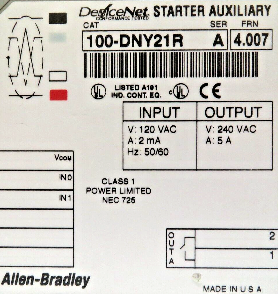 Allen-Bradley 100-DNY21R DeviceNet Starter Auxiliary, Series A