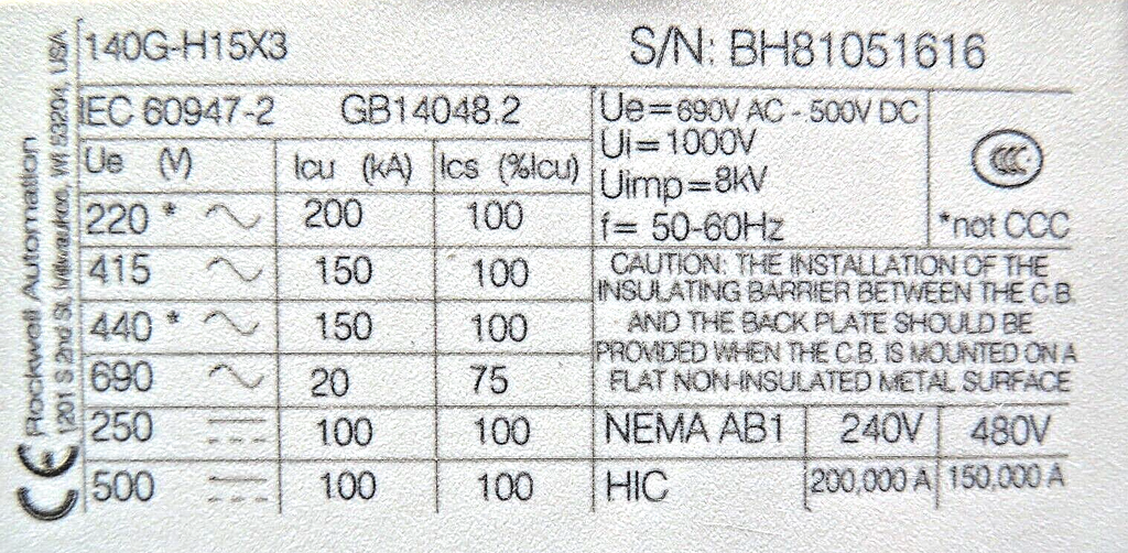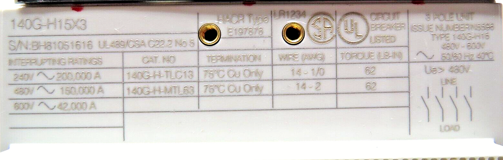 Allen-Bradley 140G-H15X3 125A Molded Case Circuit Breaker 140G-HTH3-C60 Trip LSI