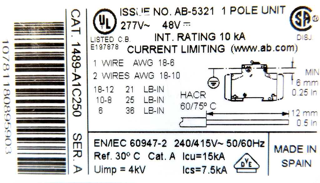 Allen-Bradley 1489-A1C250 Circuit Breaker 25A 1-Pole 277 VAC C-Curve Trip