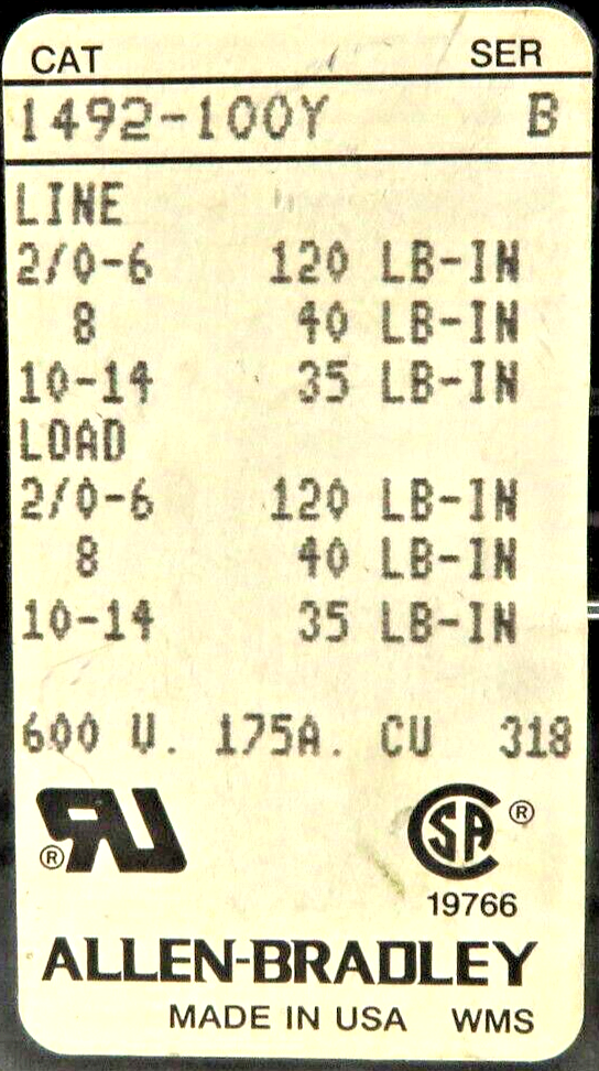Allen-Bradley 1492-100Y Power Distribution Block, 1-Pole, 175A, 600V