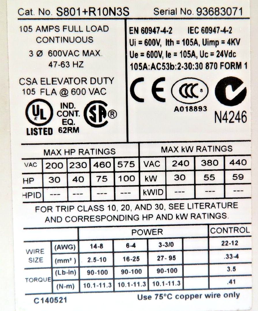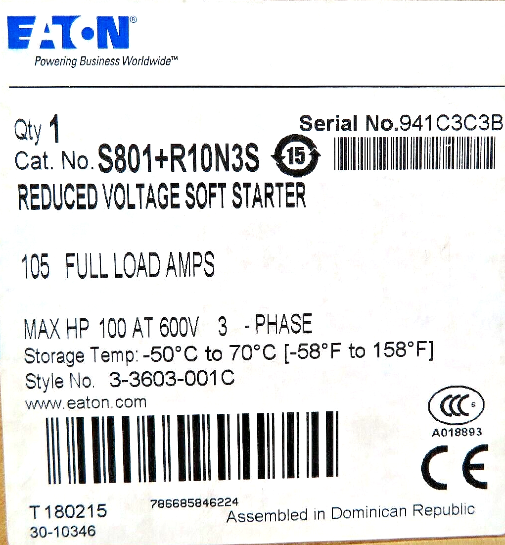 Eaton S801+R10N3S 3 Phase Soft Starter 105A 100HP 600VAC