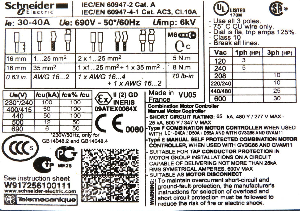Schneider TeSys GV3P40 Motor Circuit Breaker 3P 40A 690V DIN Mount Thermal-Mag