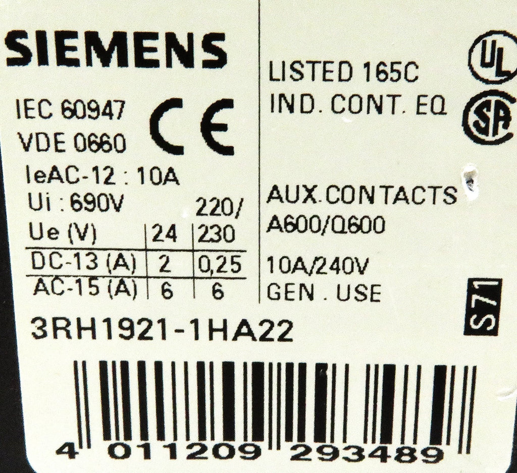 Siemens 3RH1921-1HA22 Auxiliary Contact Block 4-Pole 2NO/2NC 690V 6A
