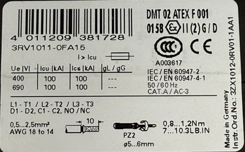 Siemens 3RV1011-0FA15 Adjustable Circuit Breaker 0.35-0.50A 690V 3-Pole