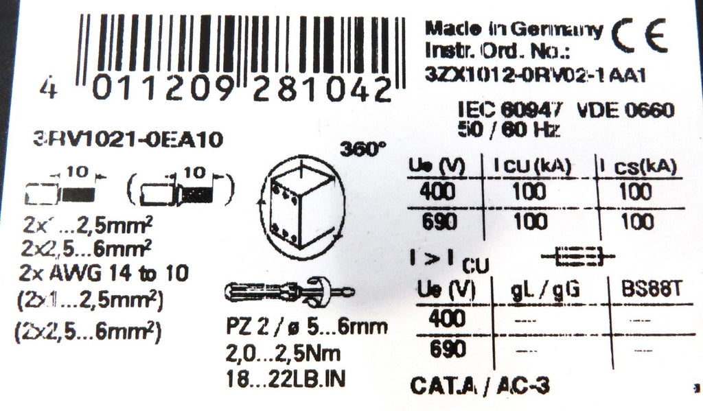 Siemens 3RV1021-0EA10 Motor Protector Circuit Breaker 0.28-0.4A 3-Pole S0