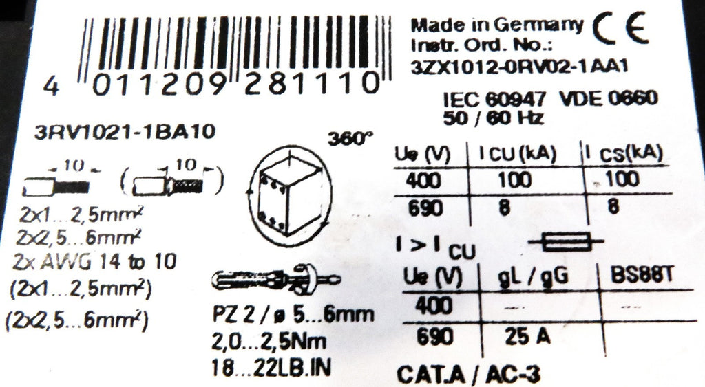 Siemens 3RV1021-1BA10 Motor Protection Circuit Breaker 1.4-2A 3-Pole S0
