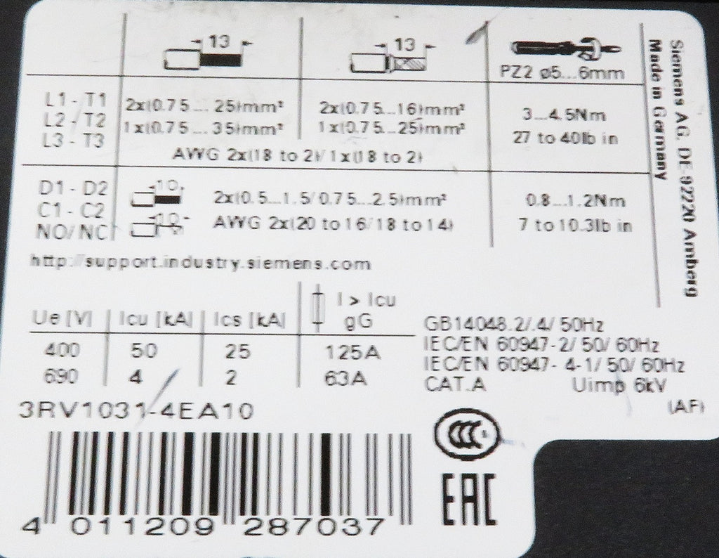Siemens 3RV1031-4EA10 Motor Protection Circuit Breaker 22–32A S2 3-Pole