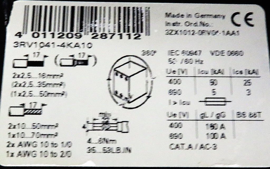 Siemens 3RV1041-4KA10 Motor Circuit Breaker 75A 690V Sirius 3R Series