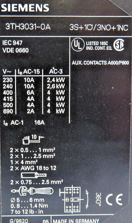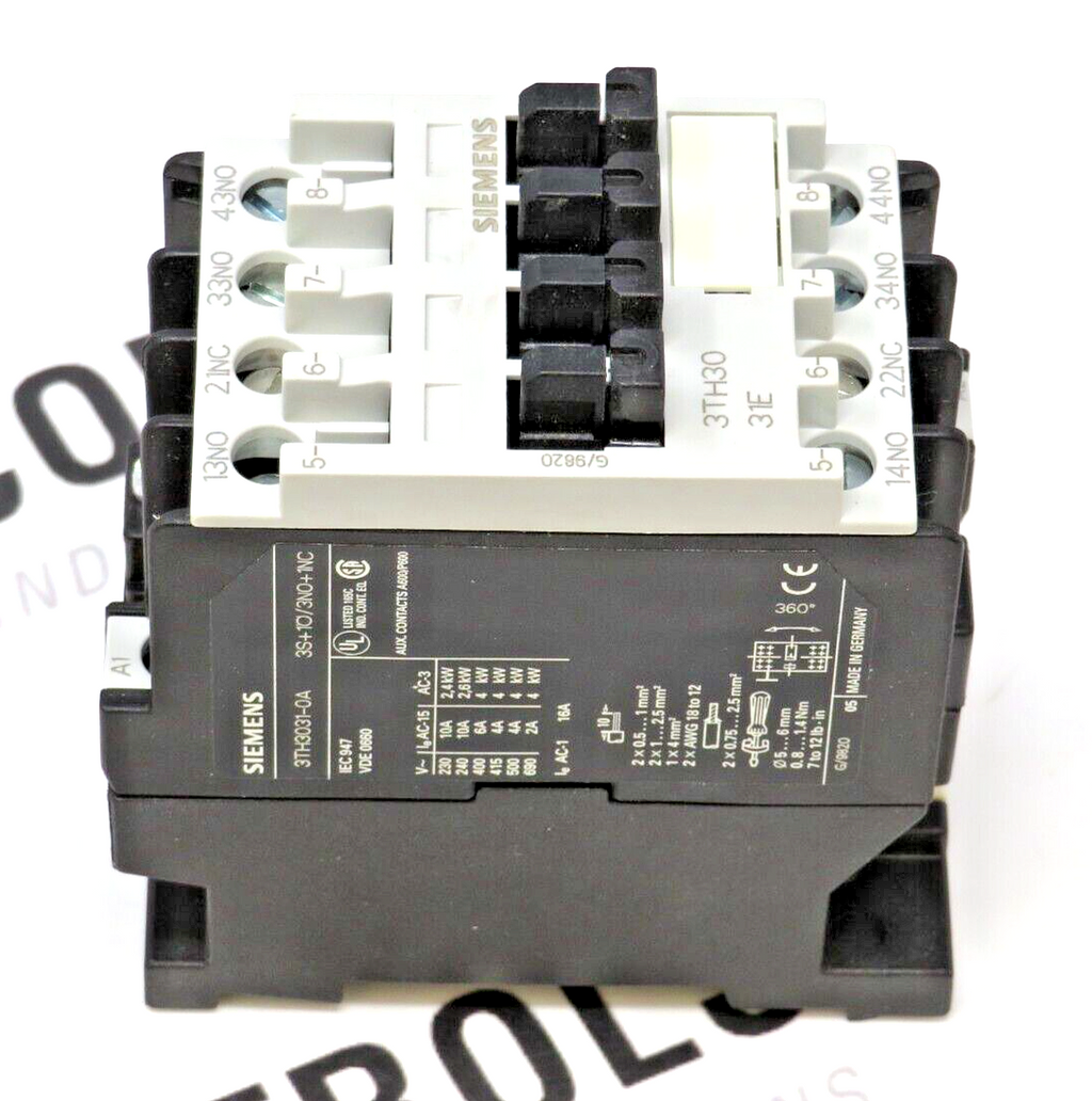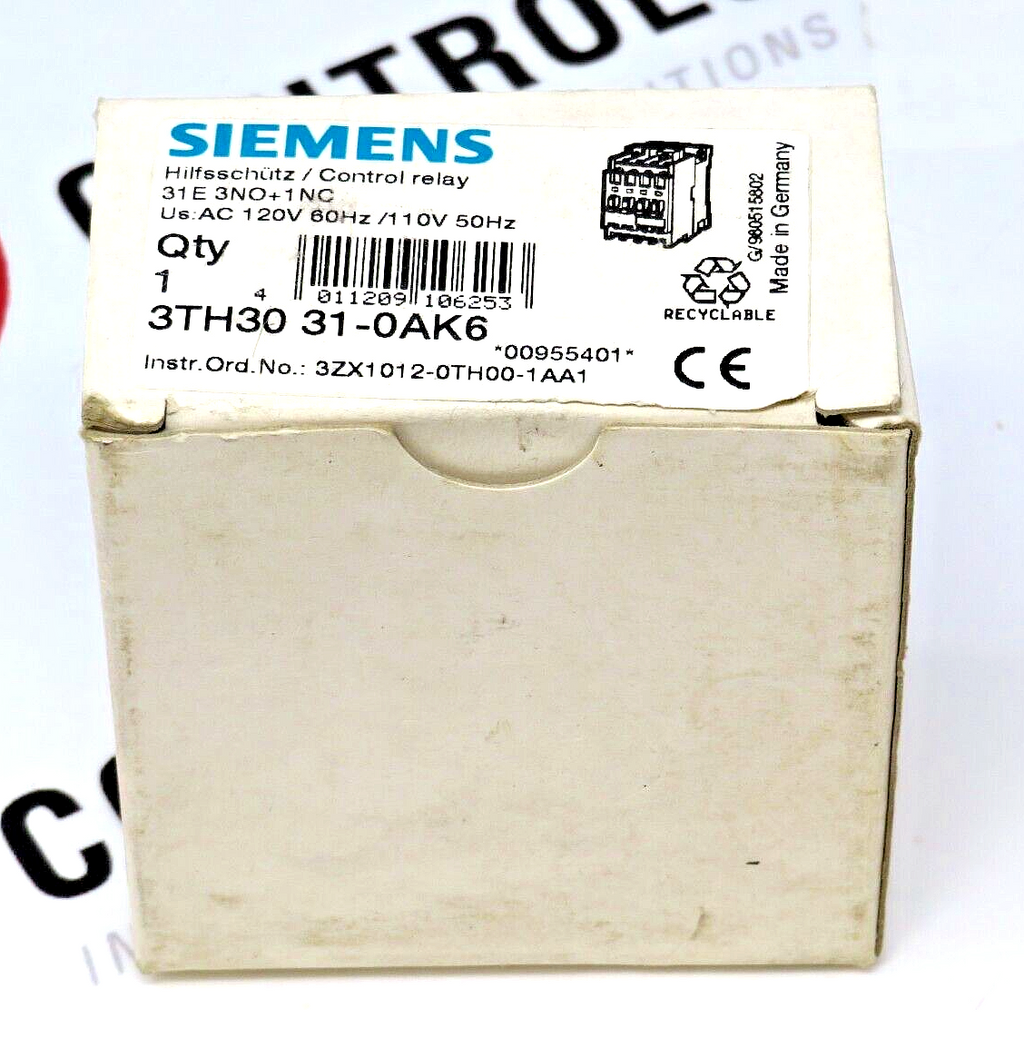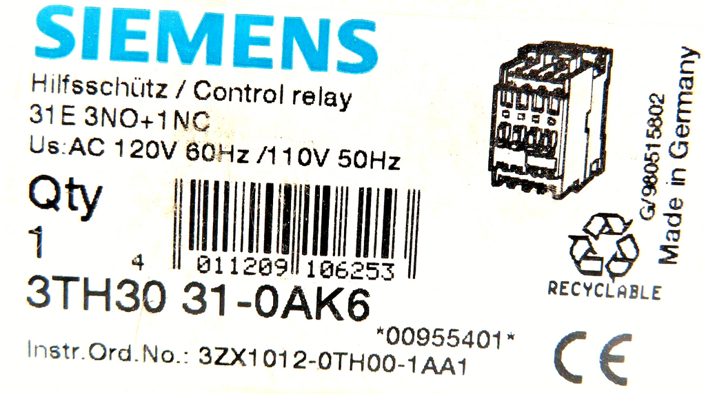 Siemens 3TH3031-0AK6 4-Pole 3NO/1NC 110/120V 50/60HZ Control Relay