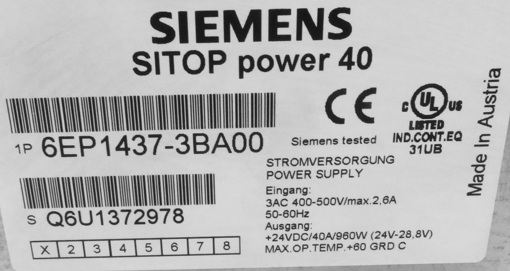 Siemens 6EP1437-3BA00 SITOP Power 40 24VDC 40A Industrial Power Supply