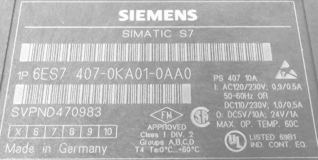 Siemens 6ES7407-0KA01-0AA0 S7-400 Power Supply Module 120/230V 10A