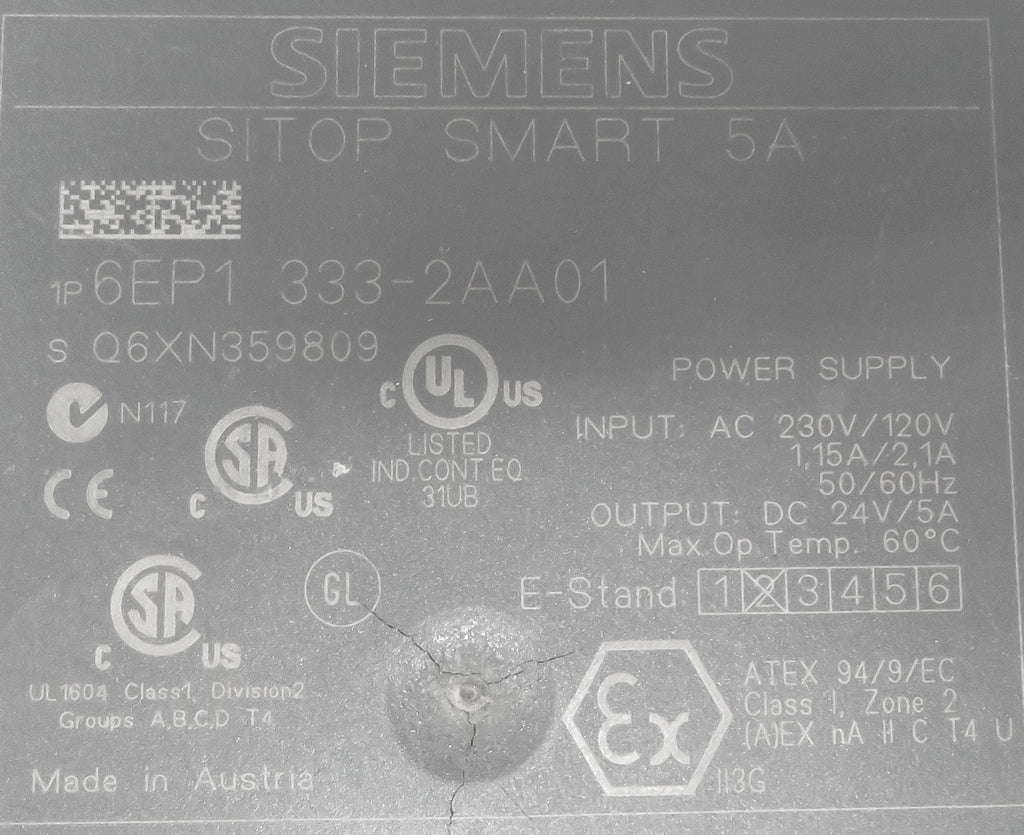 Siemens SITOP Smart 6EP13332AA01 24VDC 5A Power Supply 120W 120/230V