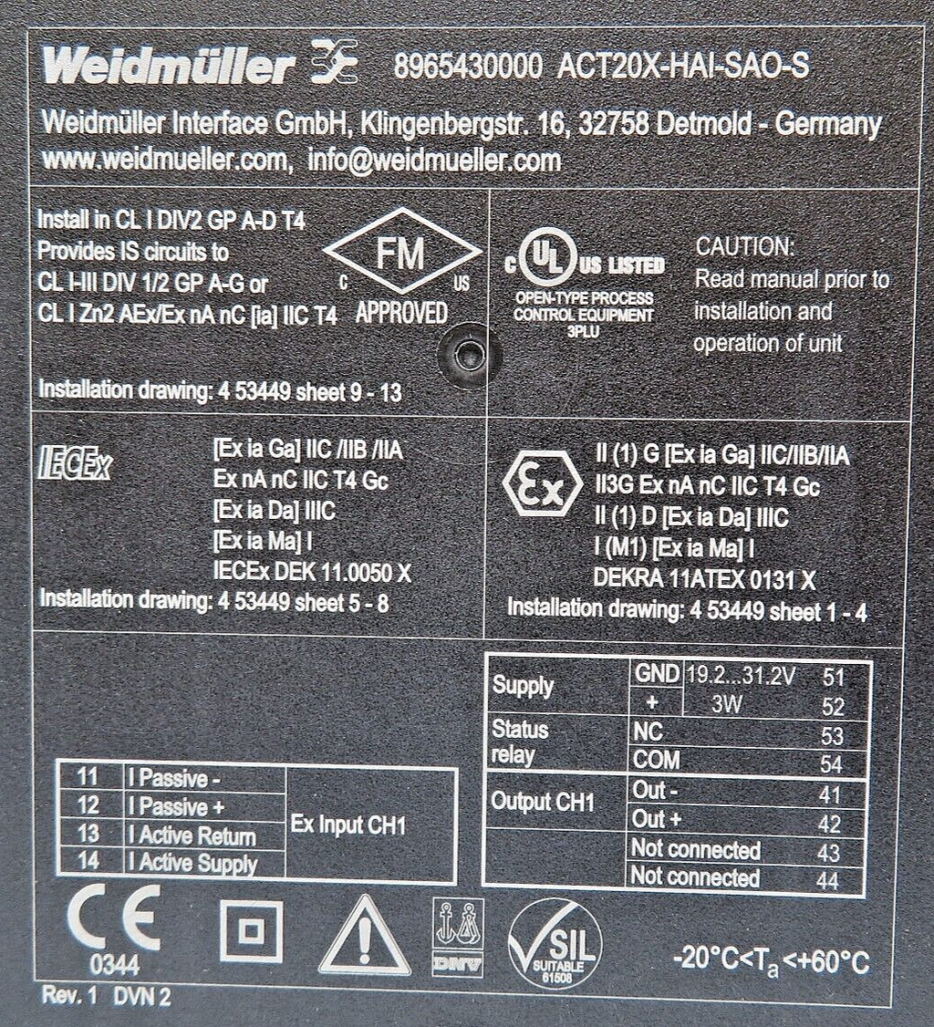 Weidmuller ACT20X-HAI-SAO-S 8965430000 EX Signal Isolating Converter 1- Channel