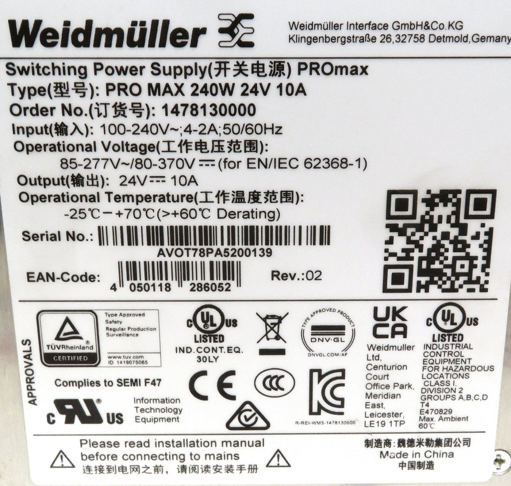 Weidmüller PRO MAX 1478130000 24V 10A 240W Power Supply DIN Rail Mount
