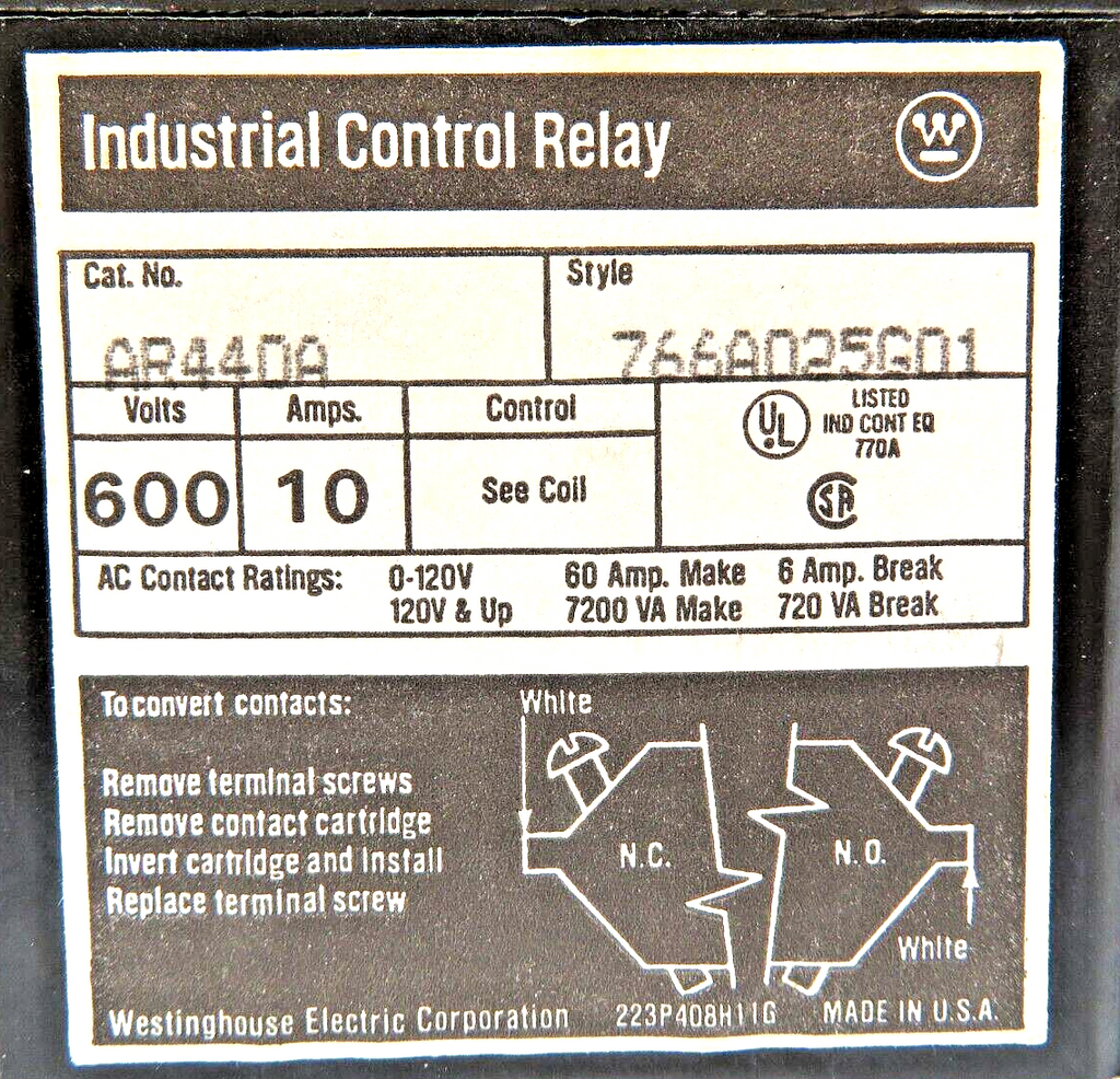 Westinghouse AR440A Industrial Control Relay 10A 120VAC 4-NO 4-Pole