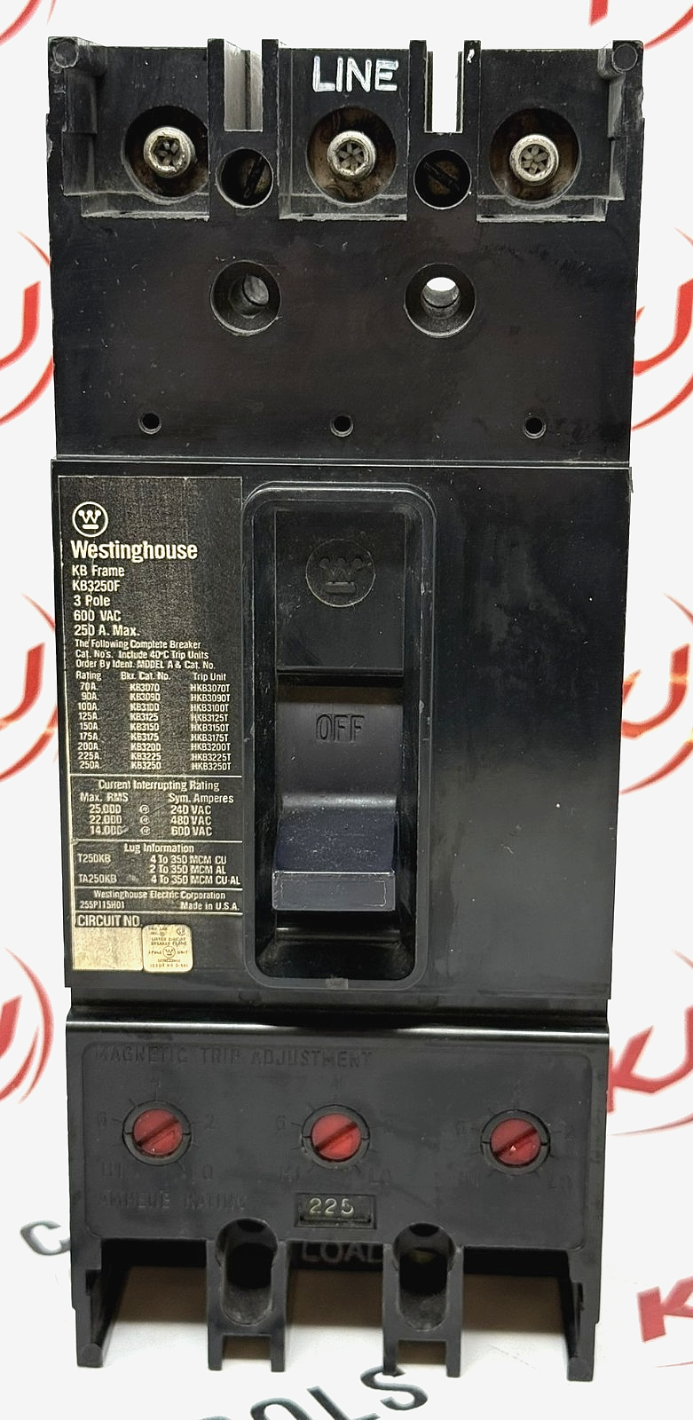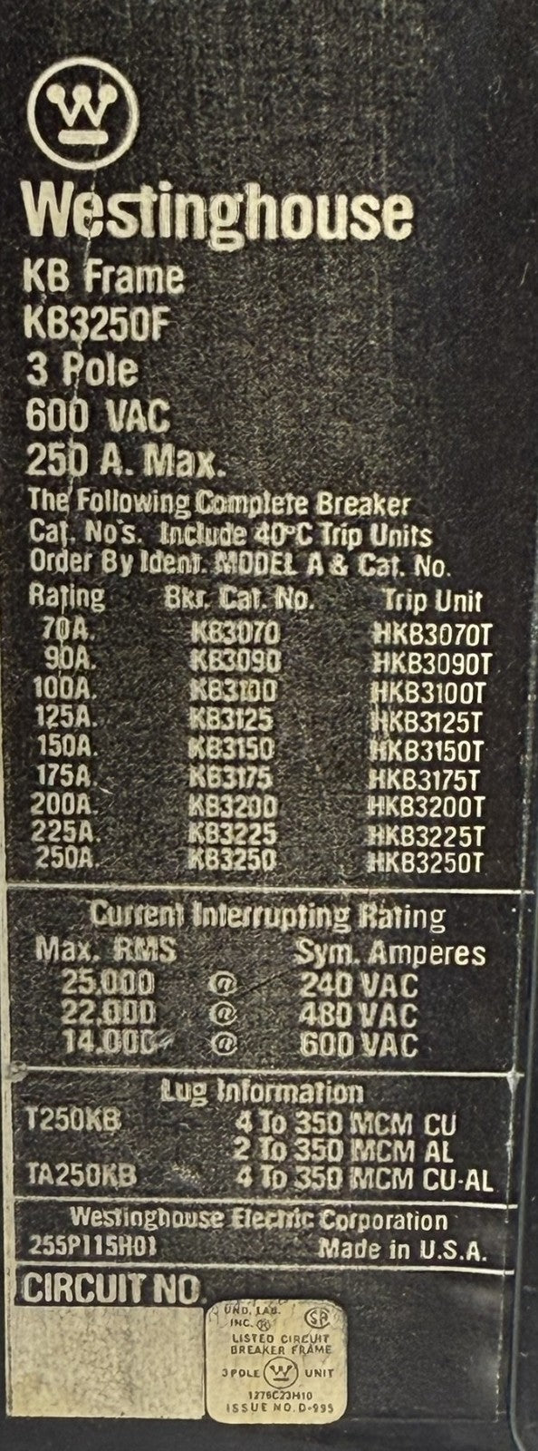 Westinghouse KB3250F Molded Case Circuit Breaker 250A 3 Pole w/ HKB3225T Trip